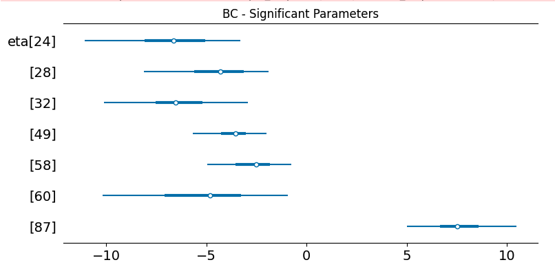 What I was really excited to dig into was the explanatory analysis. Our model uses a error-tolerant variant of the sparsity-inducing Finish Horseshoe prior that we call the Santa Barbara Horseshoe. This prior enables our model, with only a few examples, to confidently separate meaningful parameters from noisy ones.